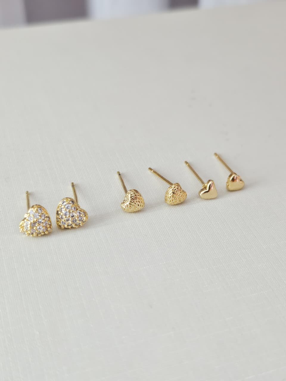 Trio de brincos corações, sendo 2 cravejados e 1 liso.