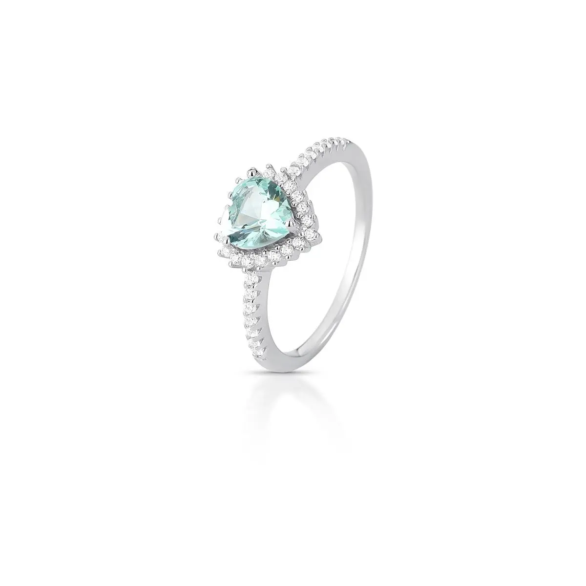 Anel composto por cristal verde claro em formato de coração acompanhado de zircônias em contorno.