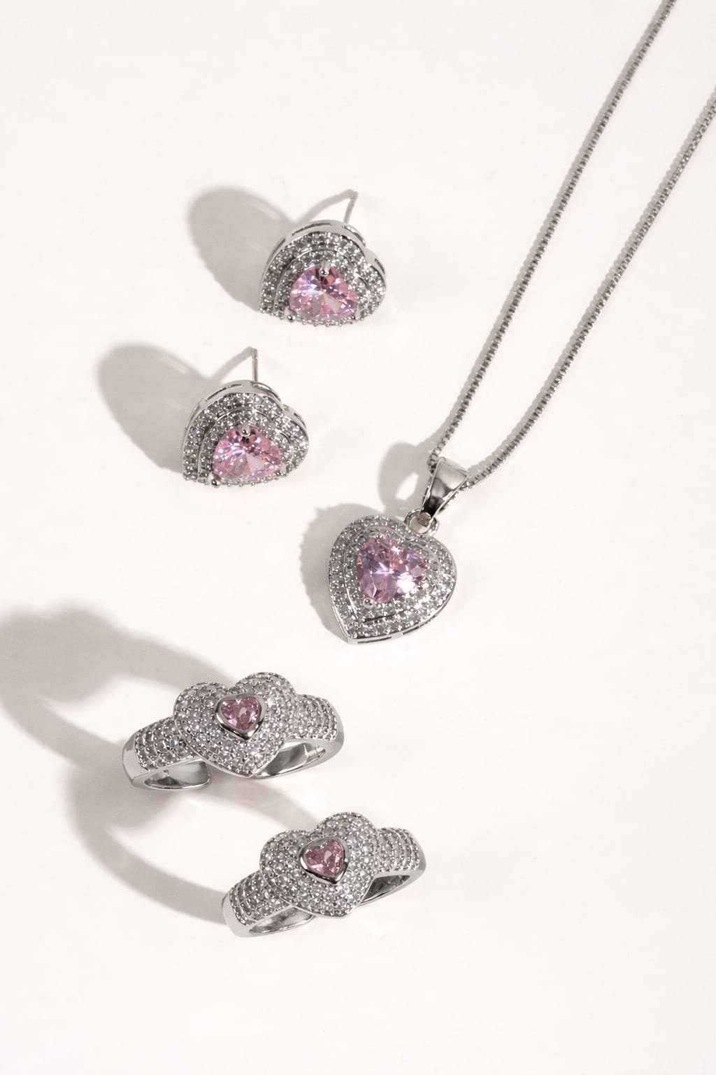 Anel regulável cravejado com zircônias e cristal coração rosa quartzo.