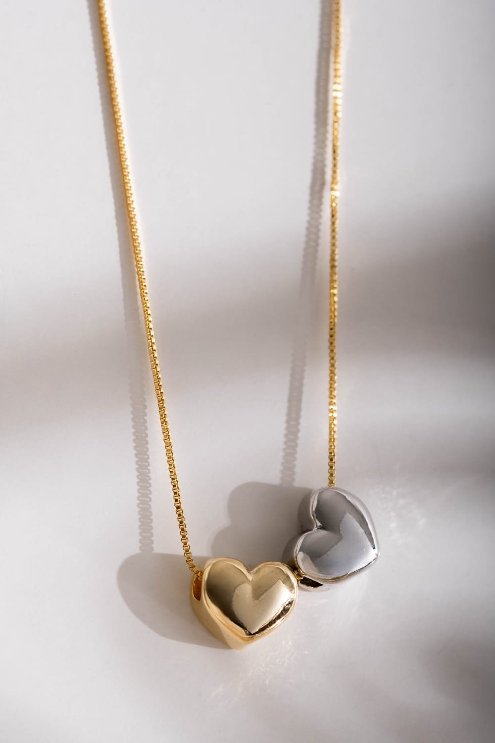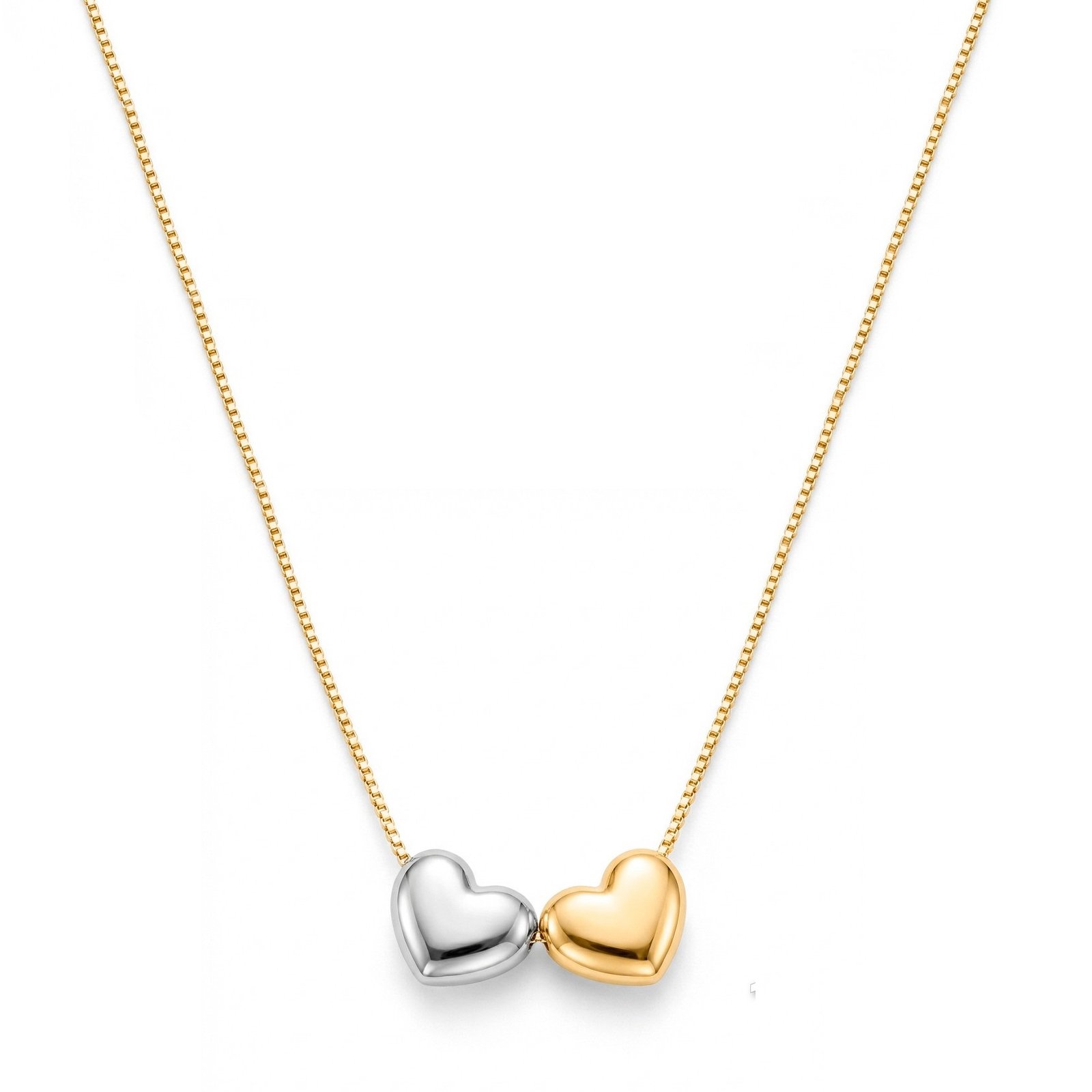 Colar bicolor com pingentes corações.