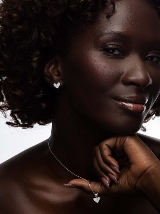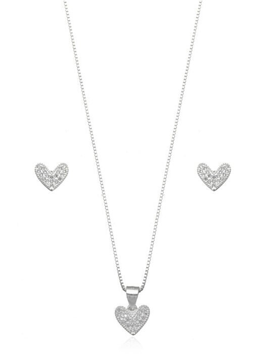 Conjunto brinco e colar coração em prata 925 cravejado com zircônias.
