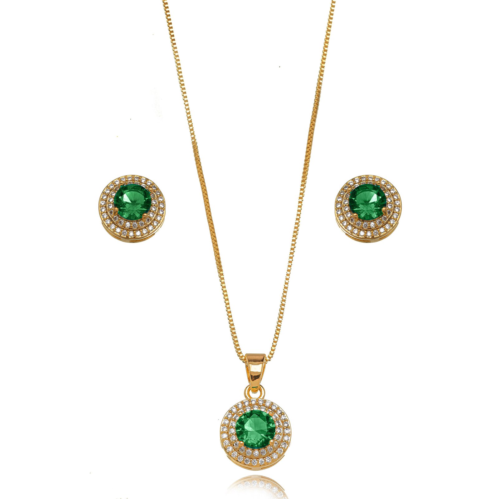 Conjunto redondo cravejado com zircônias brancas e cristal verde.