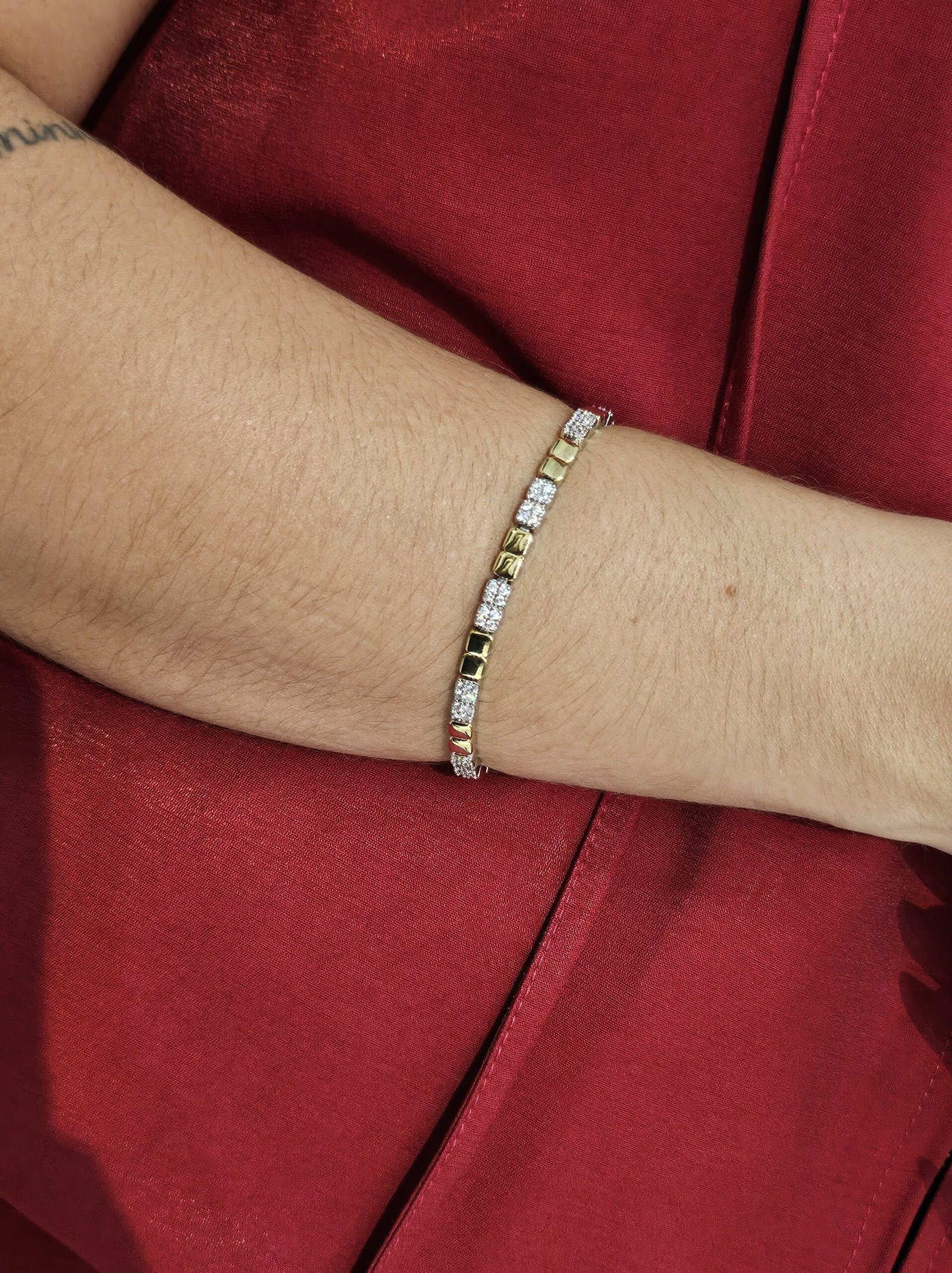 Pulseira quadradinhos lisos banhados a ouro e quadradinhos cravejados banhados a ródio branco.