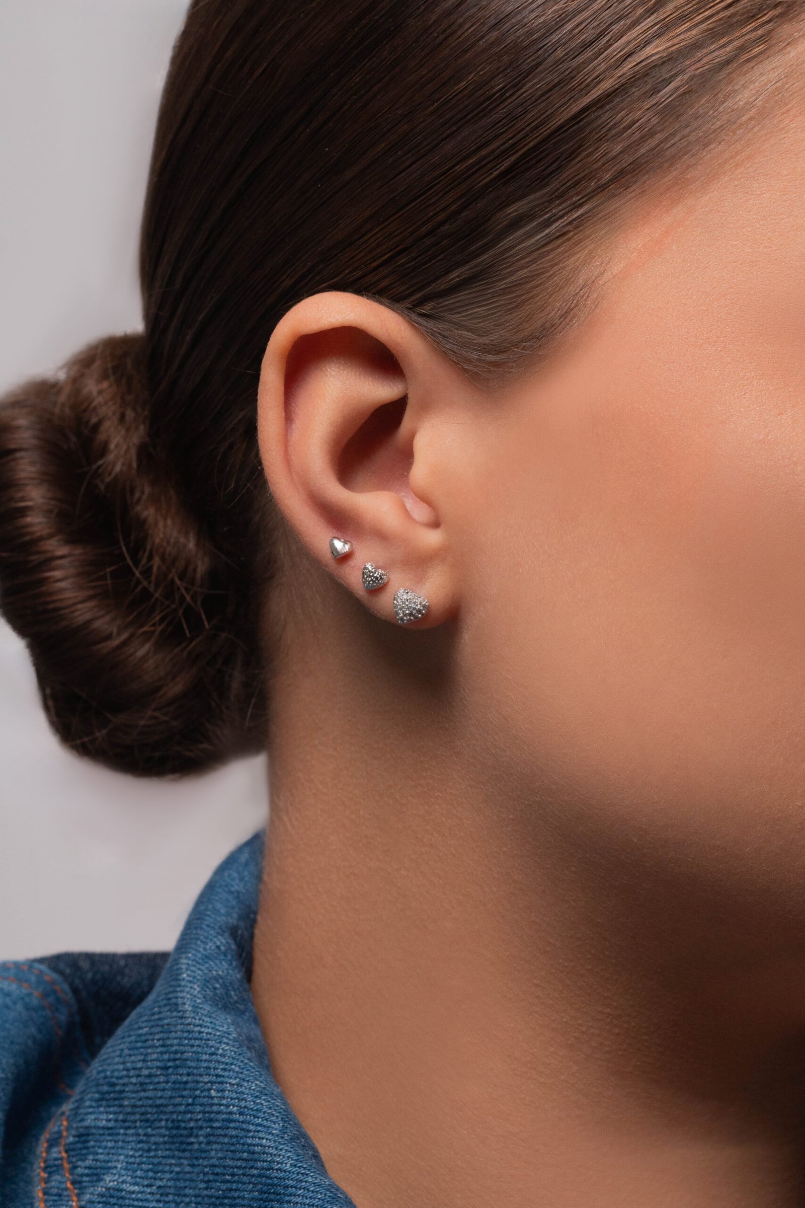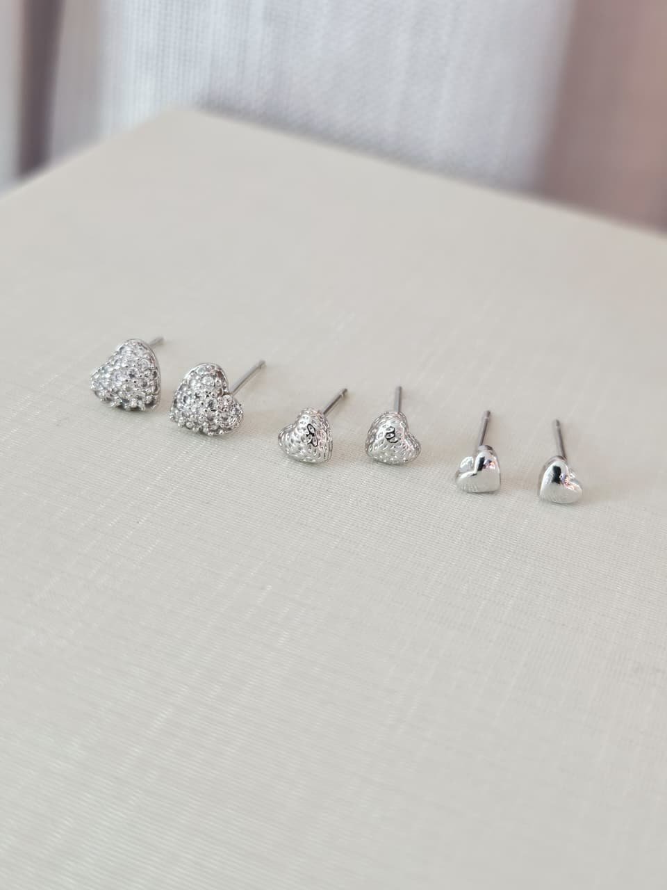 Trio de brincos corações, sendo 2 cravejados e 1 liso.